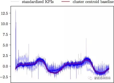 对于大量的未分类曲线,只需计算其与各聚类中心的相似性距离,将其分派到距离最近的类别。特别的,互相关理论中通常认为NCC小于0.8(对应SBD距离大于0.2)意味着两曲线没有强相关性,因而,若一条KPI与各聚类中心的SBD距离均大于0.2,则该KPI被划分为离群点,表明其与任何聚类簇在形状上均不相似。由此,通过快速的分派策略,能够快速对海量KPI根据形状进行分类。一组标准化后的KPI组成的聚类簇如图5所示,其中红色曲线为聚类中心,表征了该类别的形状特征。