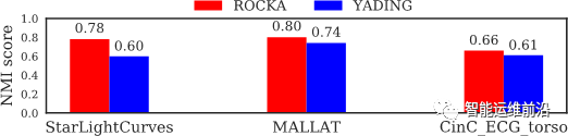 对于真实KPI数据,作者采用了两个数据集进行评测。数据集1是来自不同集群机器的TPS/QPS数据,数据集2是来源于大量机器的机器级别指标(例如响应时间、CPU利用率等)。如表1所示,ROCKA在两数据集上均取得了很好的准确率(F-score)及计算效率,且仅有少数曲线被划分为离群点。而YADING仅采用简单的L1距离作为度量,且未做对异常点和相位偏差的处理。虽然也达到了较高准确率,但有近半的曲线被其划分为离群点。即,YADING仅将十分相似的曲线划分为若干小聚类簇,而对异常、噪声、相位偏差等形状变化鲁棒性较差,从而将大量曲线误分为离群点。这对于大规模的KPI异常检测并不能起到有效帮助。