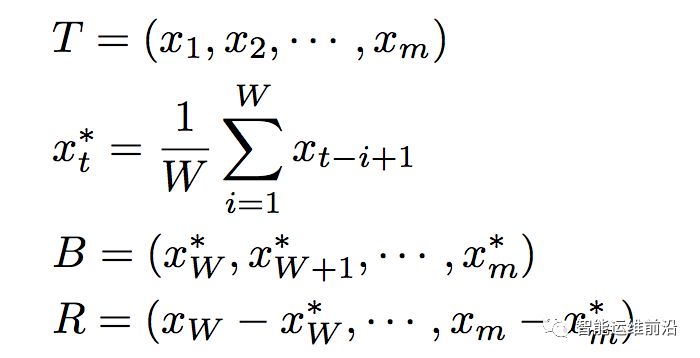 此外,一条实际KPI曲线可被视为一条平滑的基线(表征了曲线的正常模式)和许多随机噪声组成。一个简单有效的去除噪声的方法是在KPI曲线上使用一个小的滑动窗口做滑动平均,将曲线分为基线与余项两部分。对于KPI T,应用大小为W的滑动窗口,步长为1,其基线B和余项R可由下式计算,效果如图3所示。