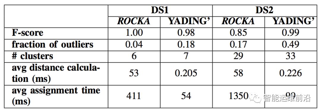 作者在3个公开时序数据集及2个真实KPI数据集上对算法的性能和效率进行了测试,并与前沿的大规模时序曲线聚类算法YADING相比较。