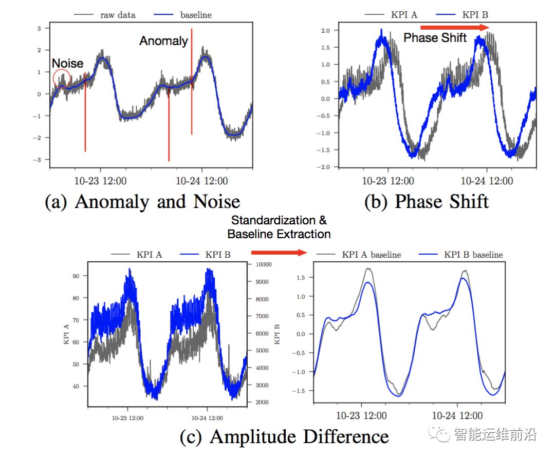KPI本质上是一种时序数据,对KPI的聚类主要面临两种挑战:其一,KPI曲线上的噪声、异常、相位偏差和振幅(量纲)差异通常会改变KPI曲线的形状,从而影响对KPI的相似性判别,难以用传统方法实现快速准确的聚类。其二,一条KPI曲线通常包含上万个数据点,时间跨度从几天到数周,从而完整的刻画其曲线模式(例如周期性、季节性等)。因此,KPI曲线通常具有较高的维度,进一步增加了对聚类的挑战。