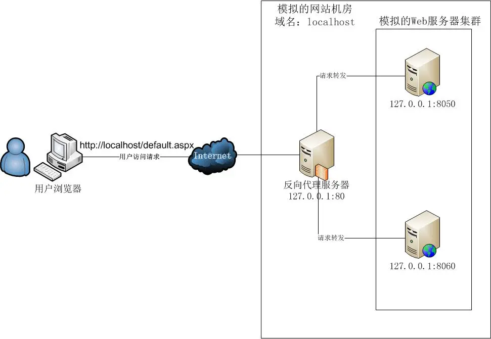 这里我们主要在Windows环境下,通过将同一个Web网站部署到不同服务器的IIS上,再通过一个统一的Nginx反响代理服务器对外提供统一访问接入,实现一个最简化的反向代理和负载均衡服务。但是,受限于实验条件,我们这里主要在一台计算机上进行反向代理、IIS集群的模拟,具体的实验环境如下图所示:我们将nginx服务和web网站都部署在一台计算机上,nginx监听http80端口,而web网站分别以不同的端口号(这里是8050及8060)部署在同一个IIS服务器上,用户访问localhost时,nginx作为反向代理将请求均衡地转发给两个IIS中不同端口的Web应用程序进行处理。虽然实验环境很简单而且有限,但是对于一个简单的负载均衡效果而言,本文是可以达到并且展示的。