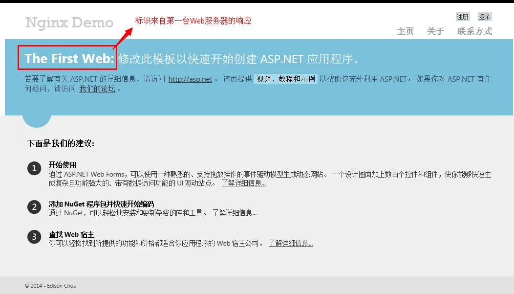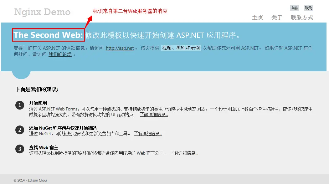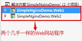 (1)在VS中新建一个ASP.NET Web应用程序,但是为了在一台计算机上展示效果,我们将这个Web程序复制一份,并修改两个Web程序的Default.aspx,让其的首页显示不同的一点信息。这里Web1展示的是“The First Web:”,而Web2展示的则是“The Second Web”。