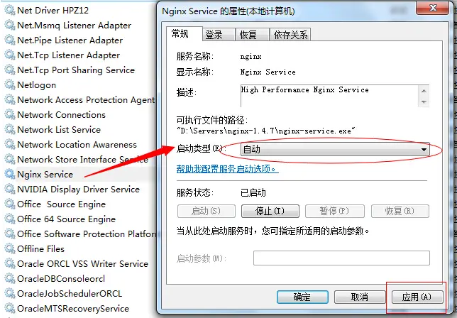 ⑤接下来就可以在Windows服务列表看到Nginx服务了,这里我们可以将其设置为自动启动了: