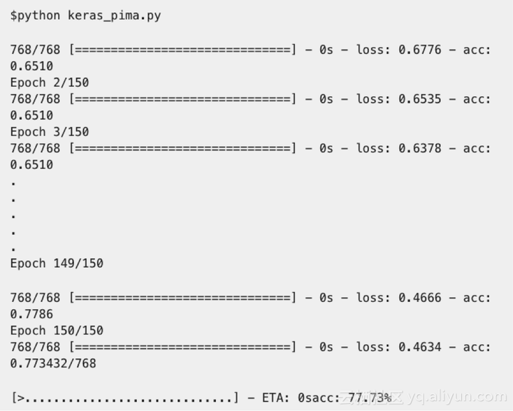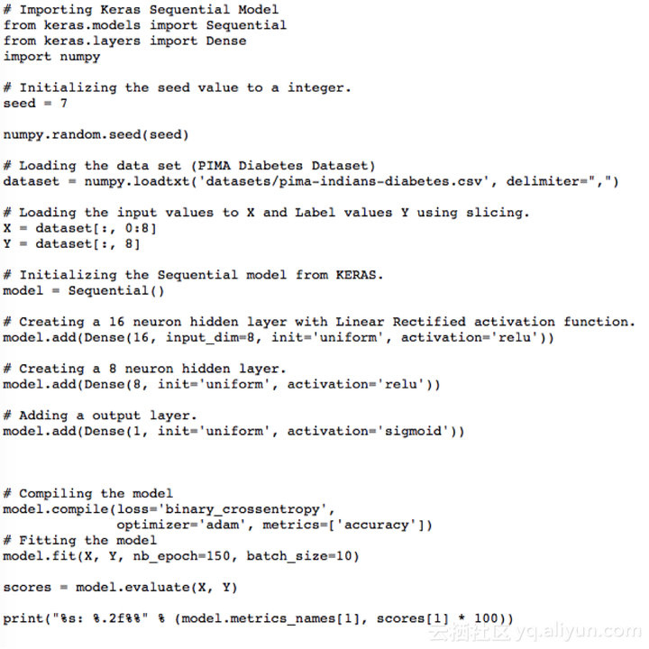 全连接层用Dense表示。我们可以指定层中神经元的数量作为第一参数,指定初始化方法为第二参数,即初始化参数,并且用激活参数确定激活函数。既然模型已经创建,我们就可以编译它。我们在底层库(也称为后端)用高效数字库编译模型,底层库可以用Theano或TensorFlow。目前为止,我们已经完成了创建模型和编译模型,为进行有效计算做好了准备。现在可以在PIMA数据上运行模型了。我们可以在模型上调用拟合函数f(),以在数据上训练或拟合模型。
