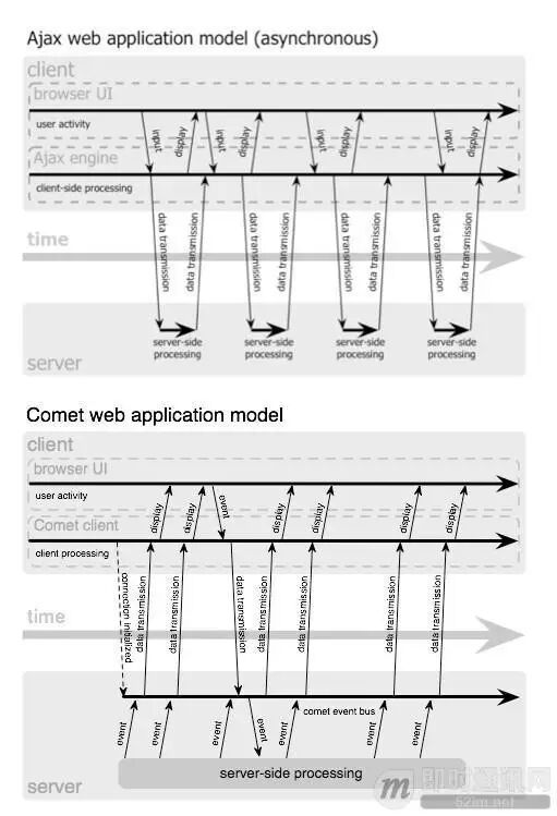 以下是典型的Ajax和Comet数据传输方式的对比,区别简单明了。