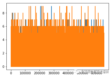 plt.plot(trainData['id'], trainData['floors_before'], trainData['id'], trainData['floors_after'])