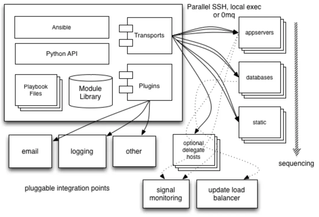 Ansible基于Python开发,集合了众多运维工具(puppet、cfengine、chef、func、fabric)的优点,实现了批量系统配置、批量程序部署、批量运行命令等功能。Ansible是基于模块工作的,本身没有批量部署的能力。真正具有批量部署的是Ansible所运行的模块,Ansible只是提供一种框架,主要包括: