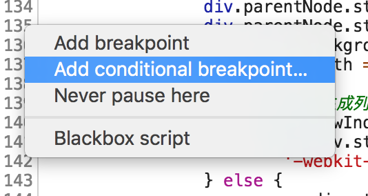 看官们不要着急,且听我们慢慢道来。在Chrome断点调试的时候,可以使用条件断点,所谓条件断点,指定一个条件,在符合这个条件的时候。执行会停止在断点处,否则执行直接往下执行。如下图,在Line Number的地方点击右键,选中 Add conditionnal breakpoint