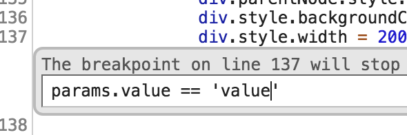 断点条件 有关条件断点说明,如果你仍然不是很熟悉的话,可以自己多参考相关资料。 但是,这个断点操作有什么关系呢?要知道,JavaScript是一门动态语言。条件判断其实是可以输入任何代码片段的。比如下面的代码: