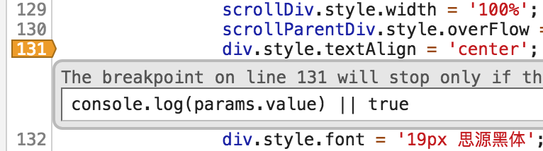 因此在条件断点的条件输入框中,我们可以输入我们想执行的断点操作即可以,比如console.log。如图所示