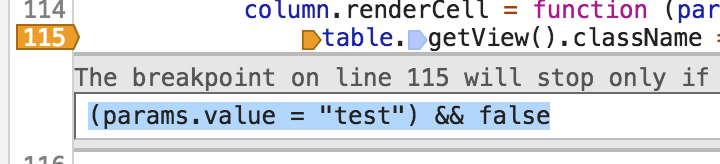 由于console.log返回值是undefined的(最终转换为false),所以代码并不会被停止在此处,而是会直接往下执行,这相当于前面讲述断点操作概念的继续执行。如果需要停止在这儿,可以设置如下的表达式即可: