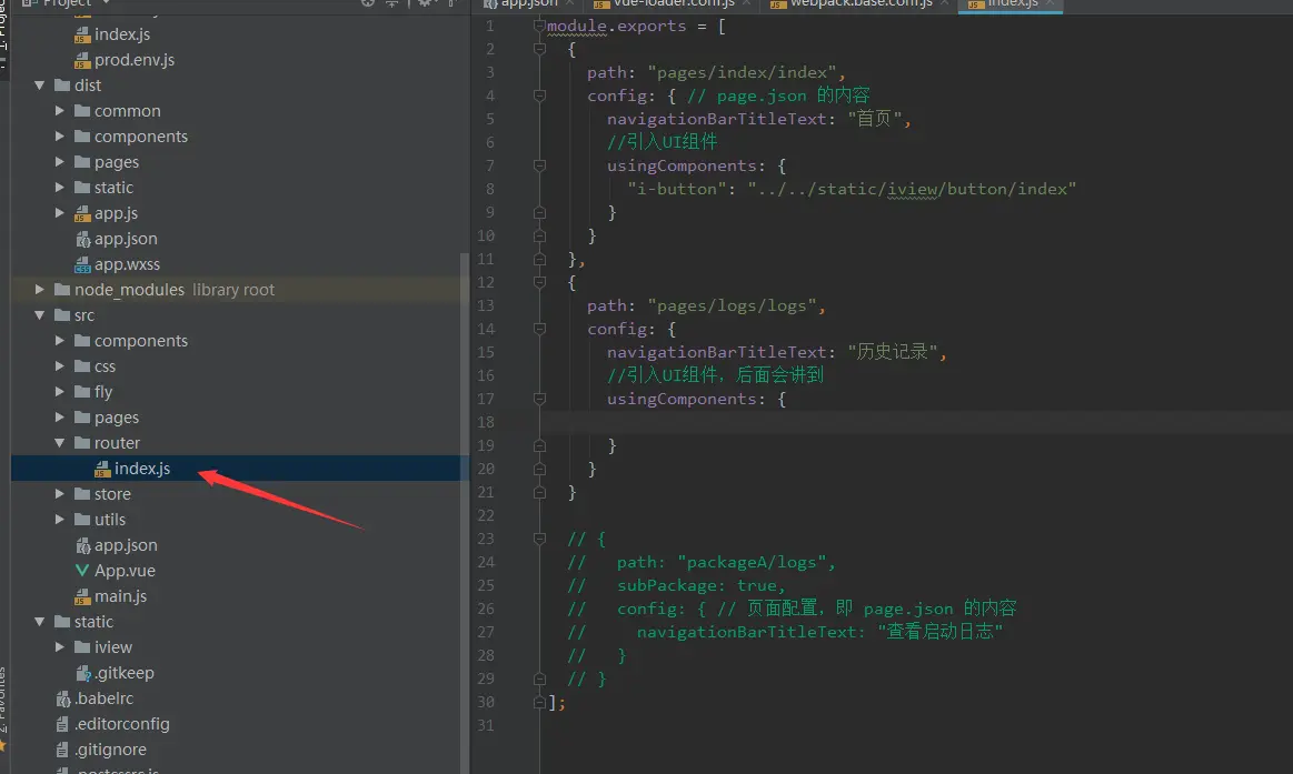 webpack.base.conf.js文件改写内容const MpvueEntry = require('mpvue-entry') const entry = MpvueEntry.getEntry("src/router/index.js") module.exports = { entry:entry, ... } plugins: [ new MpvueEntry(), ... ]) ] -