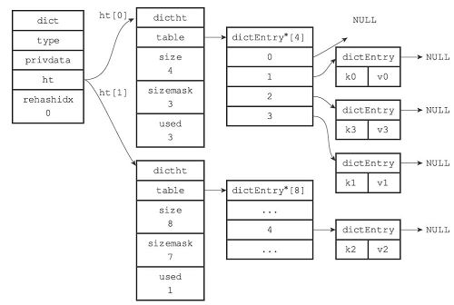 我们假设 ht[0]为正在使用的hashtable,ht[1]为rehash之后的备用hashtable
