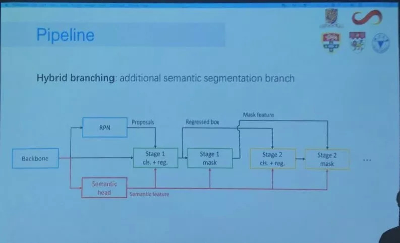 在这个比赛中MMDet团队开发了新的深度学习检测框架,从三个方面区别于以往的框架:一种新的混合级联架构,一种更智能的anchoring机制,一种新的骨干网络FishNet。(1)使用混合级联架构组织整个流程,不同任务的分支(包括比如包围框回归、掩模预测、语义分割)用交替的方式被组织起来。这种新的架构改进了信息流,以至于不同模块的信息可以更有效的交换。