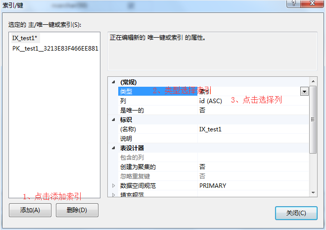 3、在索引/键弹出框-》点击添加,添加索引-》在常规窗口类型选择索引-》点击列选择索引列。