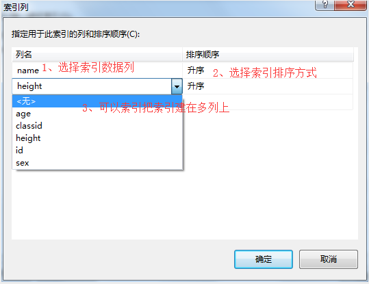 4、在索引列弹出框-》选择索引数据列-》选择索引排序方式-》可以选择把索引建在多个数据列上-》点击确定。
