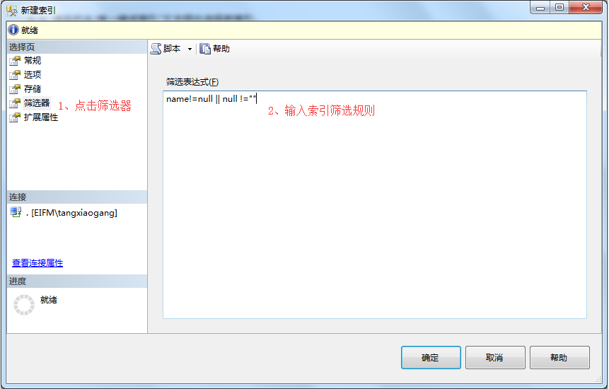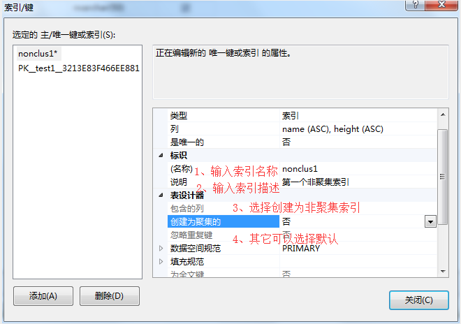 5、在索引/键弹出框-》输入索引名称-》输入索引描述-》选择创建非聚集索引-》其它可以选择自己默认,也可以根据实际情况自己设置-》点击关闭。