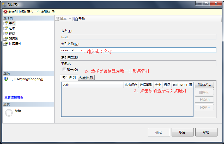 2、在新建索引弹出框-》输入索引名称-》选择是否创建为唯一非聚集索引-》点击添加,添加索引数据列。