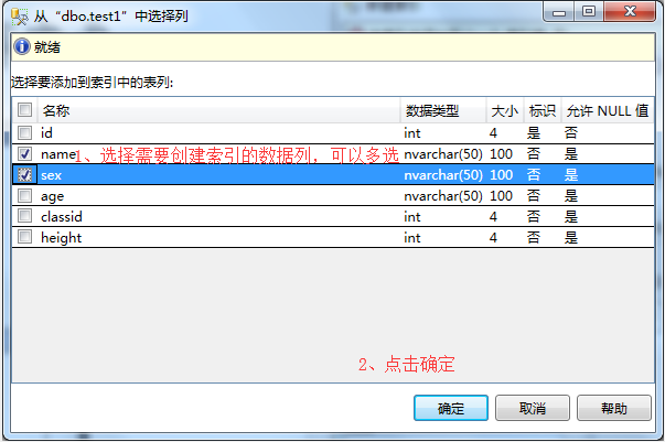 3、在数据表弹出框中-》选择需要创建索引的数据列,可以选择多个-》点击确定。