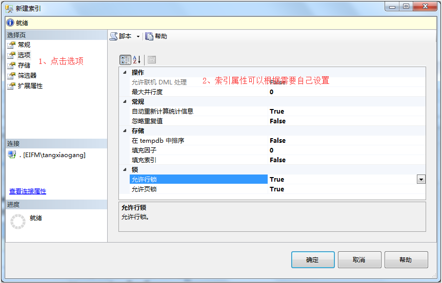 4、在新建索引弹出框-》点击选项-》可自行设置索引属性。