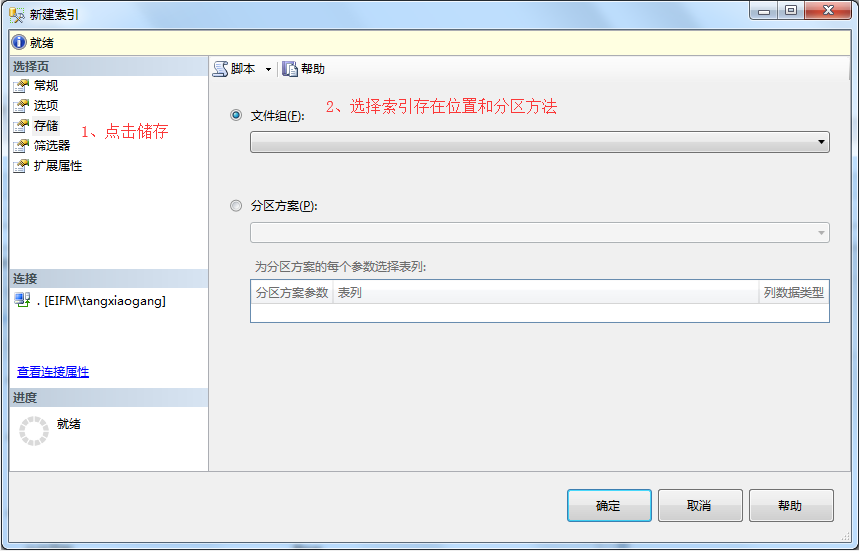 5、在新建索引弹出框-》点击储存-》选择索引存储位置和分区方法。