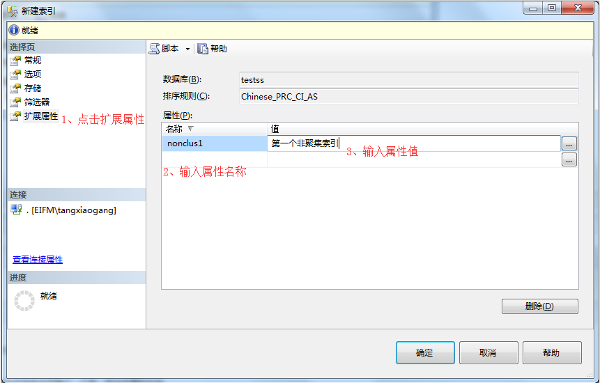 7、在新建索引弹出框-》点击扩展属性-》输入属性名称-》输入属性值-》点击确定。