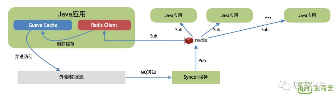 这个阶段扩展了Guava Cache,利用redis作为消息队列通知机制,通知其他java应用程序进行刷新。