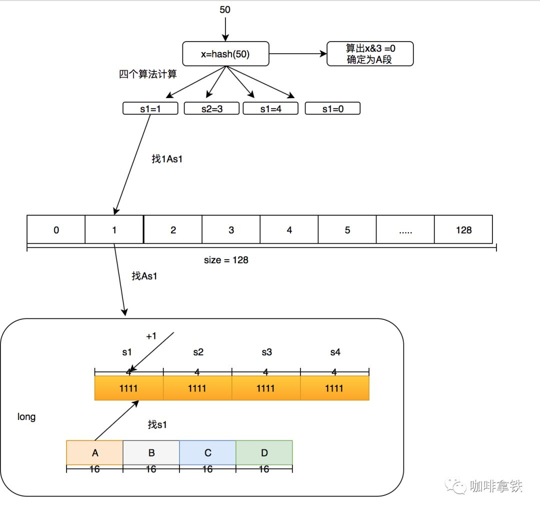 在Count-Min Sketch中,我这里直接说caffeine中的实现吧(在FrequencySketch这个类中),如果你的缓存大小是100,他会生成一个long数组大小是和100最接近的2的幂的数,也就是128。而这个数组将会记录我们的访问频率。在caffeine中他规则频率最大为15,15的二进制位1111,总共是4位,而Long型是64位。所以每个Long型可以放16种算法,但是caffeine并没有这么做,只用了四种hash算法,每个Long型被分为四段,每段里面保存的是四个算法的频率。这样做的好处是可以进一步减少Hash冲突,原先128大小的hash,就变成了128X4。