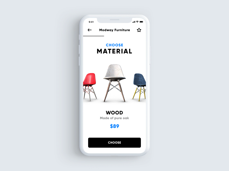 一个界面简洁舒服的电商应用程序,UI交互设计的非常棒,功能,颜色,价格一目了然,用户可根据自己的喜好来定制和购买椅子。