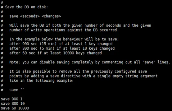 其中save 900 1的含义是:当时间到900秒时,如果redis数据发生了至少1次变化,则执行bgsave;save 300 10和save 60 10000同理。当三个save条件满足任意一个时,都会引起bgsave的调用。