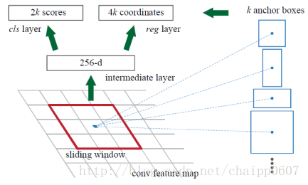 那么我们还是用AlexNet举例好了,此时的conv5特征图的尺寸为1313256,也就是这一层的特征别送入到RPN中,RPN在这个特征图上用33256的卷积核,一共用了256个。那么卷积核一次卷积之后的特征就是11256,也就是下图中的256-d,之后该特征出两个分支: