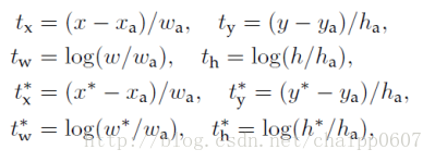而ti与ti*分布对应四个值,分别是x,y,w,h的坐标偏差,其中: