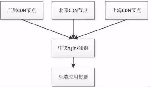 即用户首先访问到全国各地的CDN节点(使用如ATS、Squid实现),如果CDN没命中,会回源到中央nginx集群,该集群如果没有命中缓存(该集群的缓存不是必须的,要根据实际命中情况等决定),最后回源到后端应用集群。