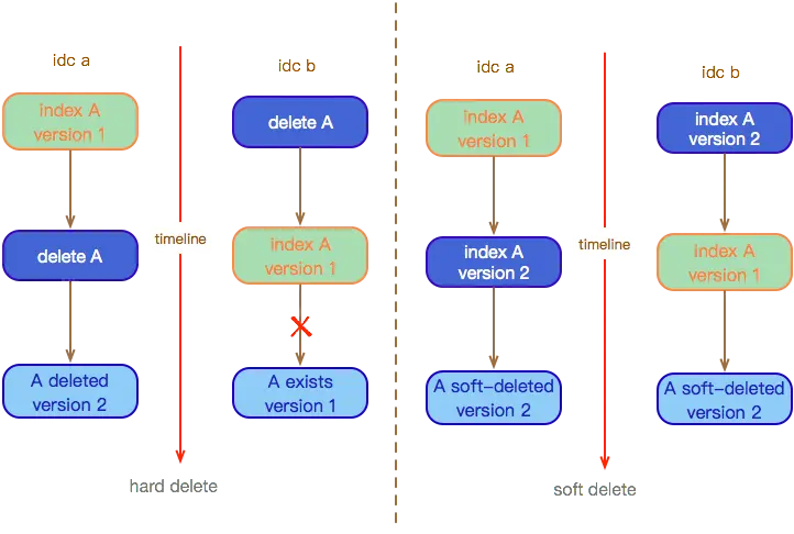 在跨机房同步过程中,数据容易因为 MQ、proxy 异步发送等影响而乱序,Elasticsearch 可以通过乐观锁来保证数据变更的一致性,避免乱序的影响,前提是 version 能够一直保持在索引中。 但是在物理删除模式下,由于数据被物理清理,无法继续保持版本号的延续,这就有可能导致跨机房数据同步的脏写。