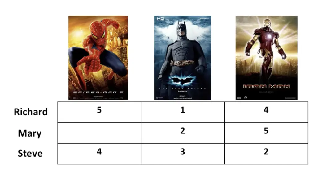 我们考虑上面的user-item矩阵。假定我们现在有了一些user对item的preference,我们接下来的目标是把空白填满,我们会选择怎么填呢?在user-based CF,我们使用两个步骤: