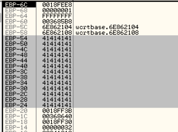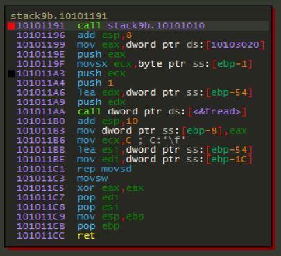 离开0x10101010之后,我们会看到它用fread读取了fichero.dat的[ebp-1]字节并将他们存储在一个指向(ebp-54)的缓冲区中,好的,这是一个缓冲区溢出,让我们分析一下。