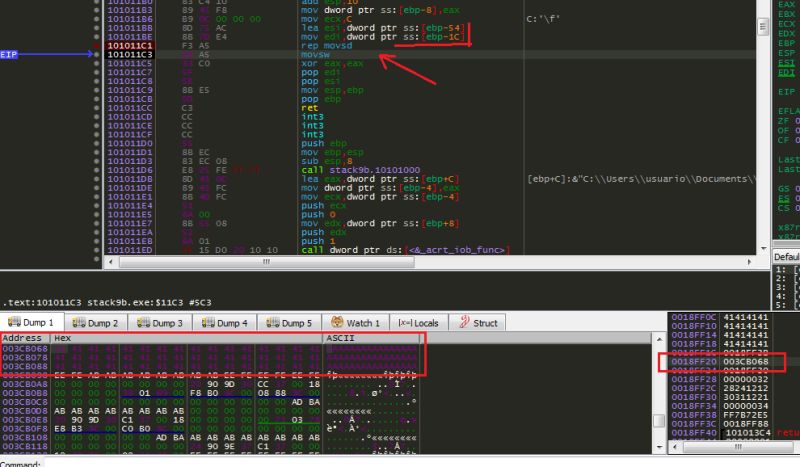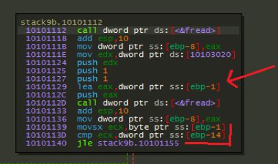 [ebp-1]是fichero.dat的第9个字节。fread的大小存储在缓冲区中[ebp-54],并且必须小于或等于0x32(“2”)。