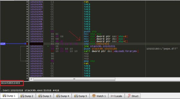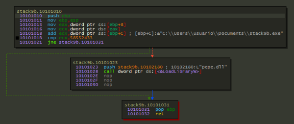 好的,它在这里做的是它取fichero.dat的前4个字节,将它们添加到以下4个字节,然后将结果与0x58552433进行比较,如果条件正确,加载“pepe.dll”。