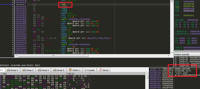 在pepe.dll寻找gadget中我找不到VirtualAlloc,但是有一个指向system()的指针,只会缺少一个return,可以使用exit()和一个固定位置的我们可以控制将一个字符串传递给system()的值。