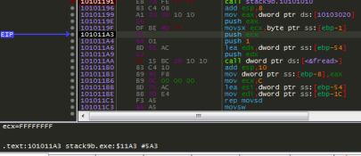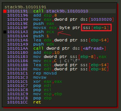 0x10101139 movsx ecx, byte ptr ss:[ebp-1]0x1010113d cmp ecx, dword ptr ss:[ebp-14]0x10101140 jle stack9b.10101155