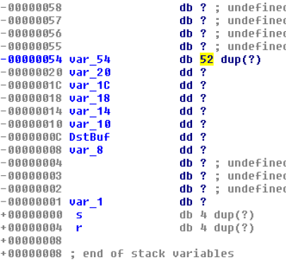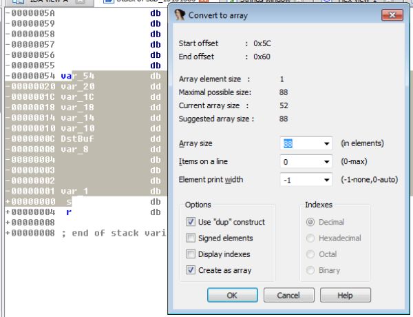 现在我们看到字节([ebp-1])是fread的读取大小,并将大小存在一个(ebp-54)52字节缓冲区,正如最近的变量是ebp-20,我们有[ebp-54]-[ebp-20]=[ebp-34],所以是0x34(52d),我们还可以看到在IDA堆栈,右键->array->ok: