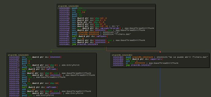这个函数有5个变量,其中4个变量被初始化为零,1个变量在(“2”)处初始化为0x32,一个指向LoadLibrary的指针存储在0x10103024处。然后以二进制读取模式fopen “fichero.dat”文件,存储文件指针在0x10103020。最后检查它是否存在,如果它不存在,它将转到0x101010d3并关闭(正如我们之前看到的);如果它存在,它将转到0x101010e9。让我们看看那里: