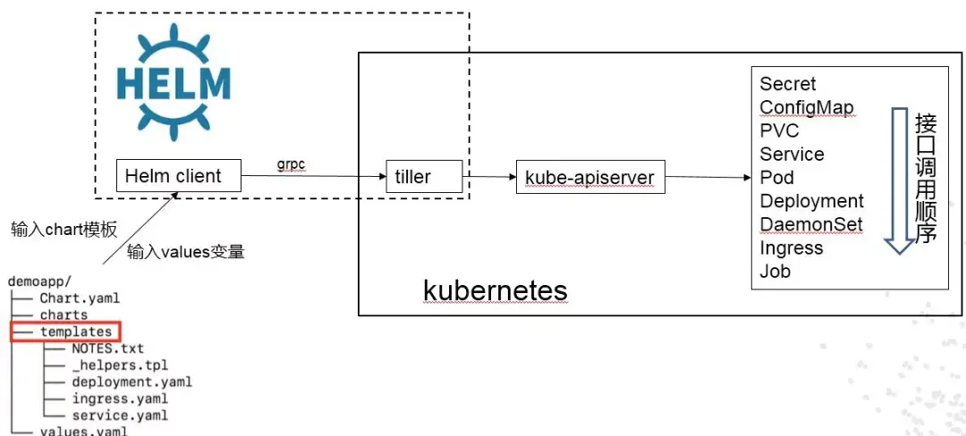 Helm 的实现原理很简单,在客户端实现变量的渲染替换,再将完整的内容传递到服务端(tiller),由 tiller 将生成的 k8s 对象按照一定的顺序调用 k8s 接口,完成应用的编排创建。