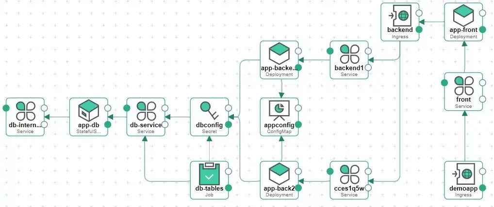 前面的分布式系统,在 AOS 编排设计后,就可以成为下面的这个图。这样的一个分布式系统,将依次创建 DB 数据库,执行创建数据库表结构的job,而数据库的访问信息将记录到secret中,由两个后端程序app1-back2,app-backend1 挂载使用。两个后端程序还同时引用了共同的配置 appconfig。前台应用通过 ingress 和 service 去访问后端程序,并提供了 ingress 用于外部访问。这个图中没有体现负载均衡器,因为这里的 ingress 配置了连接华为云的 ELB 服务。