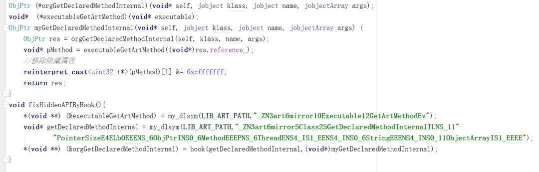 此函数是 Class.getDeclaredMethod方法在native 的实现,注意到这里是先获取的result然后才判断ShouldBlockAccessToMember ,因此我们可以hook获取 result的mirror::Class::GetDeclaredMethodInternal 这个函数,将得到的ObjPtr<mirror::Method>类型的 result想办法转换为ArtMethod* 类型即可。方法三具体实现代码如下: