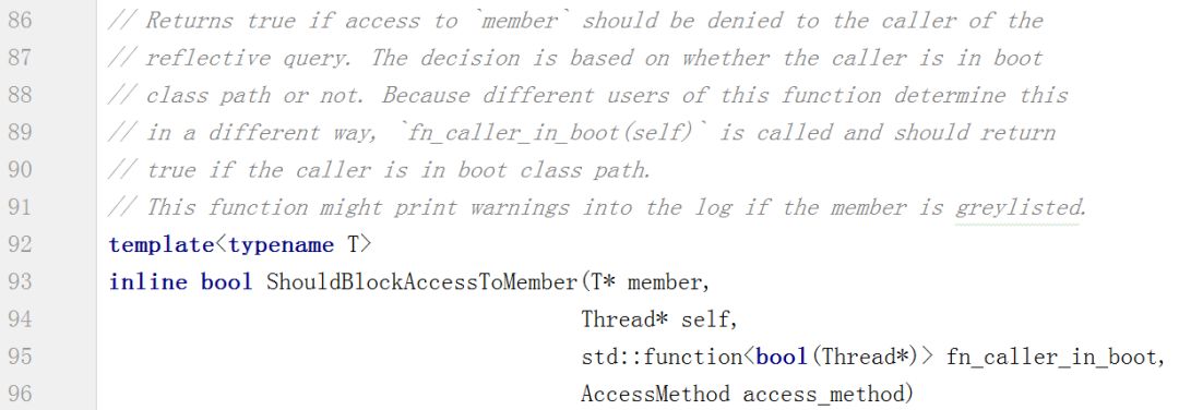 具体到Android P的代码实现,它会在所有通过反射方式和JNI 方式获取Method和Field的地方调用以下函数判断是否用户代码调用了系统的隐藏API( 位于art/runtime/hidden_api.h),如果这个函数返回true,那么说明用户代码调用了系统的隐藏API ,Android P(Preview1)会通过log 发出警告,用户代码仍然能够获取到正确的Method或Field,在后续版本中获取到的Method 或Field极有可能为空。