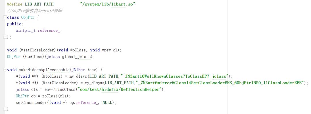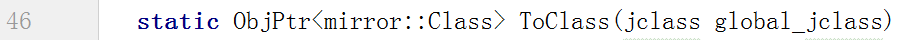 关注第二个区分点,可以发现,其实只要在BootStrapClassLoader加载的类中有任何一个帮助我们进行反射的类就能绕过这个问题,那么我们能否将我们apk 中定义的类的ClassLoader改为BootStrapClassLoader呢?答案是肯定的!查看art/runtime/mirror/class.h 可知SetClassLoader函数可以为一个类指定ClassLoader,用IDA 查看/system/lib/libart.so确认此函数位于导出符号表中。SetClassLoader的第一个参数类型为ObjPtr<mirror::Class> ,如何将jclass转化为此类型呢?通过在Android源码中查找,在art/runtime/well_known_classes.h 中有一个非常合适的函数ToClass能够完成此任务,其声明如下