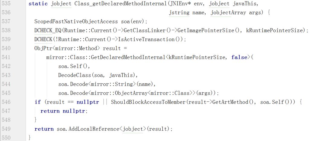 方法三通过混淆第一个区分点突破限制 。只要修改被隐藏的Method或Field对应的access_flags_ ,去掉其隐藏属性即可,下文为了论述方便,只以获取隐藏的Method为例进行说明,Field同理。实际上,只要获取到一个jmethodID ,将其强转为ArtMethod*类型,然后修改其access_flags_即可。但是后续版本中应用代码无法获取隐藏Method 的jmethodID,貌似陷入一个死循环了。但是查看源码,我们是有方法获取ArtMethod*的:art/runtime/native/java_lang_Class.cc 有以下函数: